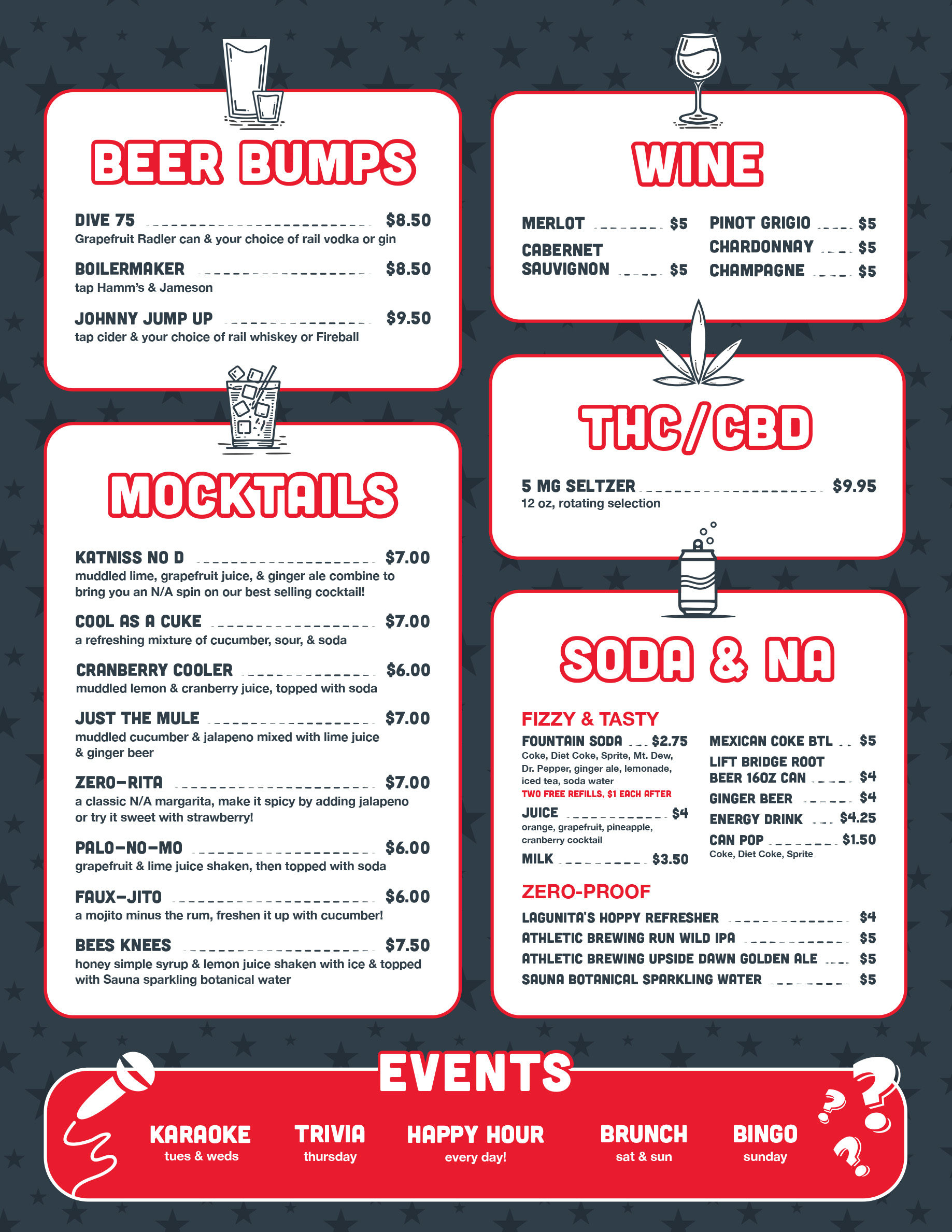 Come in and try one of our famous burgers! Our full bar offers a selection of delicious cocktails made with wine and spirits. Rock out on the jukebox, watch the game, and play some pool or pinball.