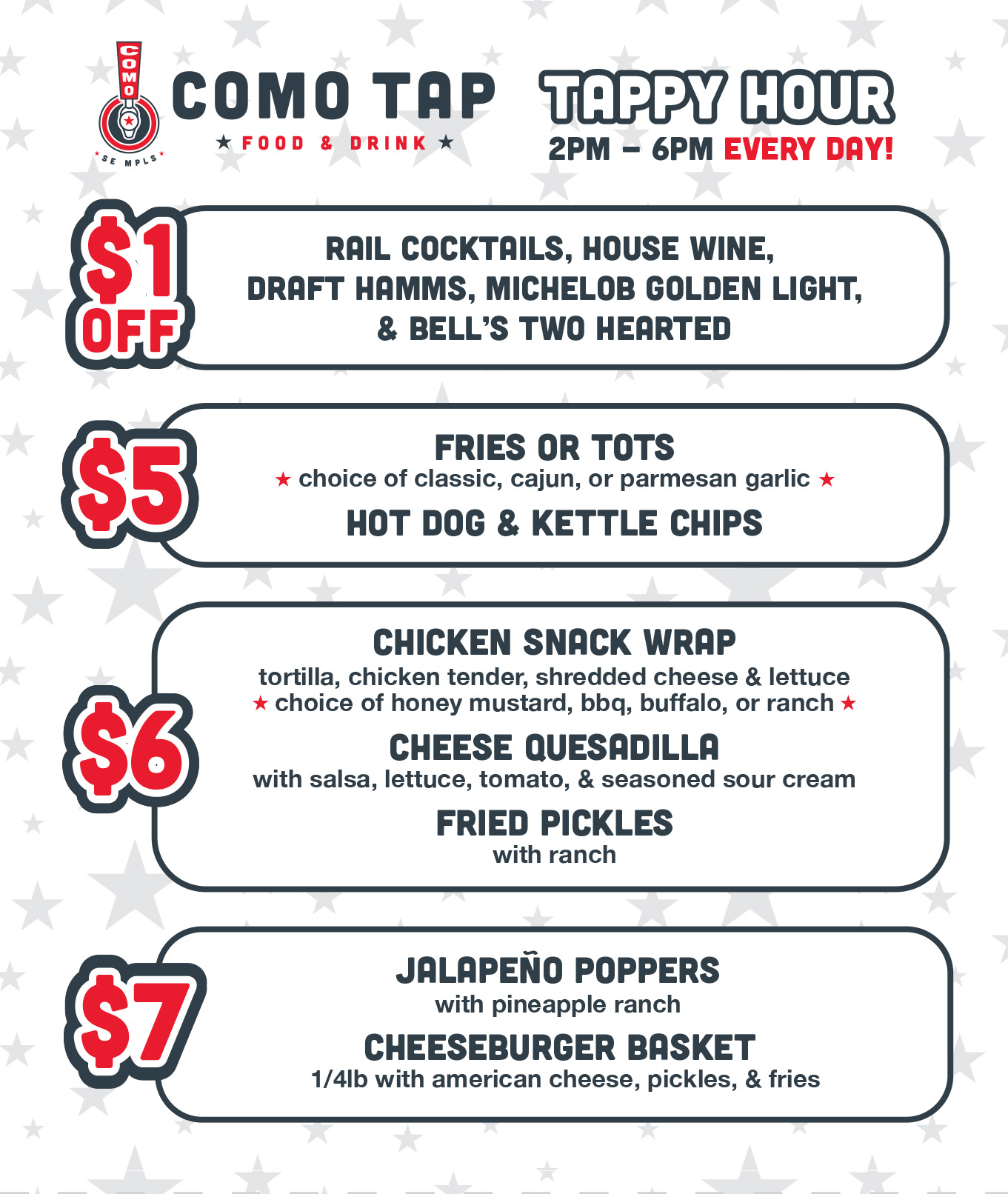 At Como Tap, the excitement doesn't stop as the night goes on, thanks to their vibrant late-night "Tappy" Hour from 9 PM to midnight. This enticing event features Hamm's beer for just $3.50, providing a perfect opportunity for patrons to unwind and enjoy the friendly, laid-back atmosphere. Whether you're wrapping up a long day or looking to kickstart your evening festivities, "Tappy" Hour at Como Tap offers an inviting setting for socializing, making new friends, and savoring the classic taste of Hamm's beer without breaking the bank.